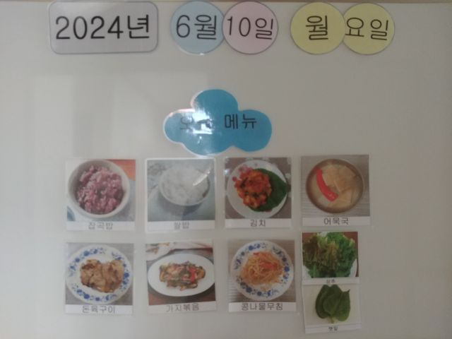 쌀밥, 잡곡밥, 어묵국, 돈육구이, 가지볶음, 콩나물무침, 김치, 상추, 깻잎, 김치