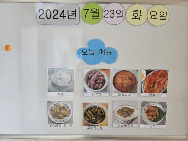쌀밥, 잡곡밥, 김치찌개, 떡볶이, 마늘쫑 무침, 고추 장아찌, 메추리알 장조림, 김치 입니다.