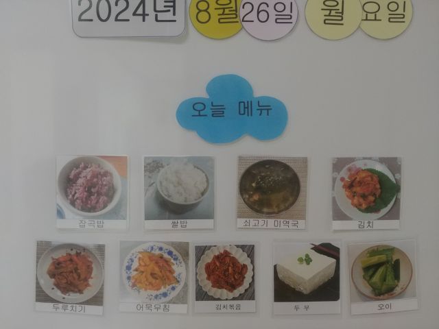 쌀밥, 잡곡밥, 쇠고기미역국, 두루치기, 두부, 어묵초무침, 김치볶음, 오이