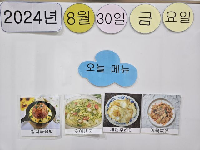김치볶음밥, 오이냉국, 계란후라이, 어묵볶음