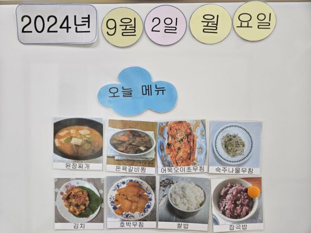 된장찌개, 갈비찜, 어묵초무침, 숙주나물, 김치, 호박나물
