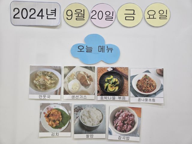 만둣국, 생선가스, 호박볶음, 콩나물조림, 김치