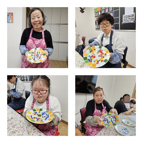 모자이크 타일과 폐 접시를 활용하여 냄비 받침대를 만들었습니다.