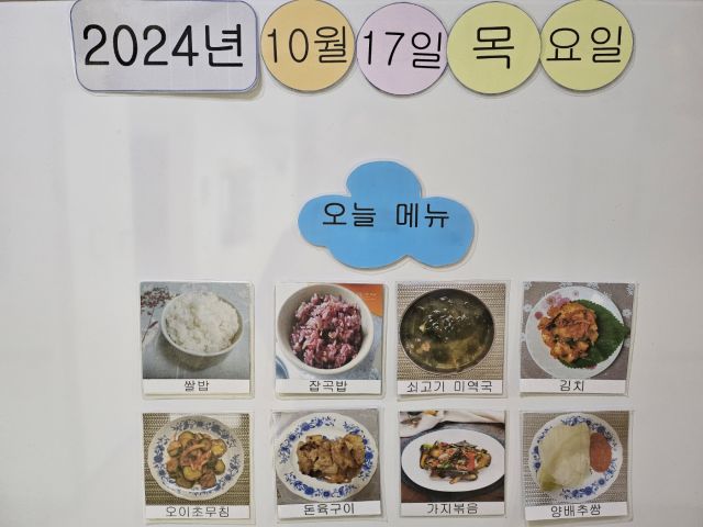 쌀밥, 잡곡밥, 쇠고기 미역국, 김치, 오이초무침, 돈육구이, 가지볶음, 양배추쌈
