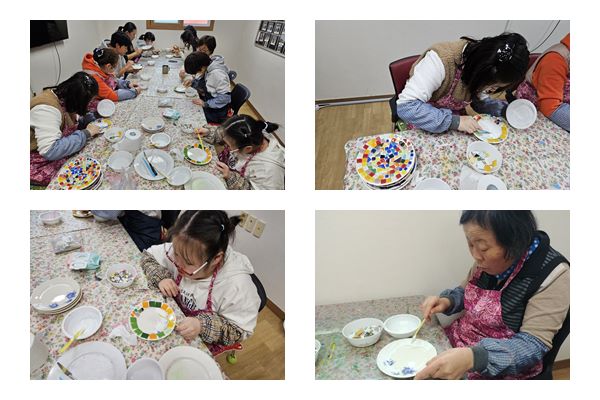 폐접시와 모자이크 타일을 이용하여 냄비받침대를 만들었습니다.