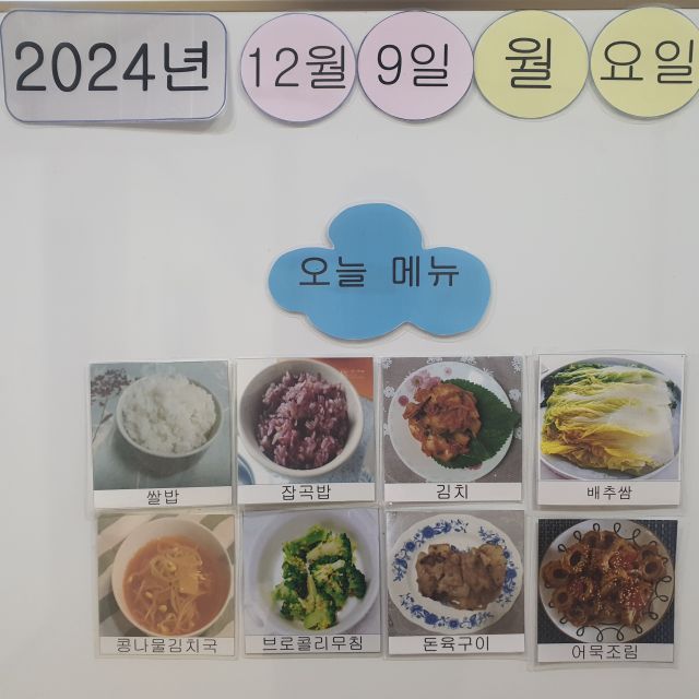 쌀밥, 잡곡밥, 김치콩나물국, 돈육구이, 보로콜리무침, 어묵조림, 배추쌈, 김치