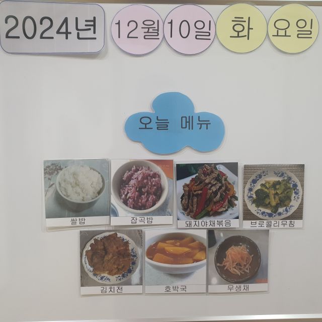 쌀밥, 잡곡밥, 호박국, 브로콜리두부무침, 무생채, 돈야채볶음, 김치부침개