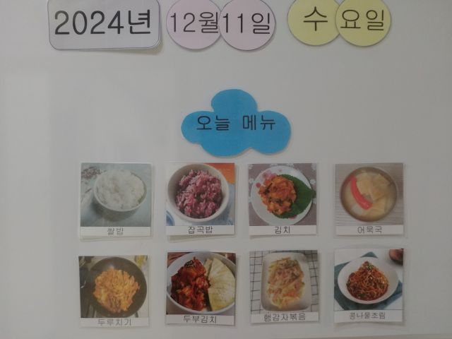 쌀밥, 잡곡밥, 어묵국, 두부김치, 감자햄볶음, 콩나물조림, 돈두루치기, 김치
