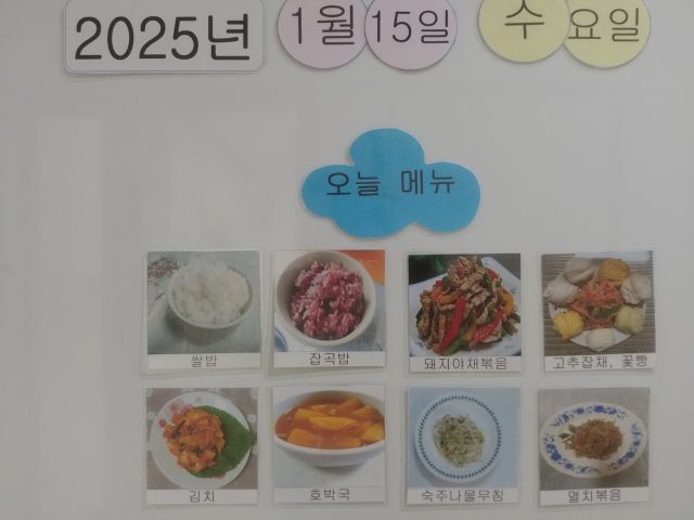 쌀밥, 잡곡밥, 호박국, 고추잡채 꽃빵, 돈야채볶음, 숙주나물무침, 멸치볶음, 김치