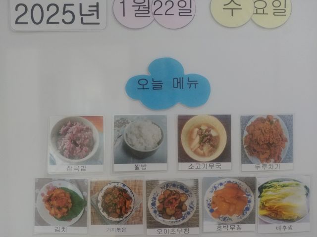 쌀밥, 잡곡밥, 쇠고기무국, 두루치기, 가지나물, 호박나물, 오이초무침, 배추쌈, 김치