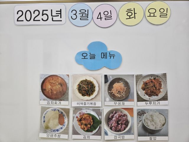 김치찌개, 미역줄기볶음, 무생채, 돈두루치기, 양배추쌈, 김치