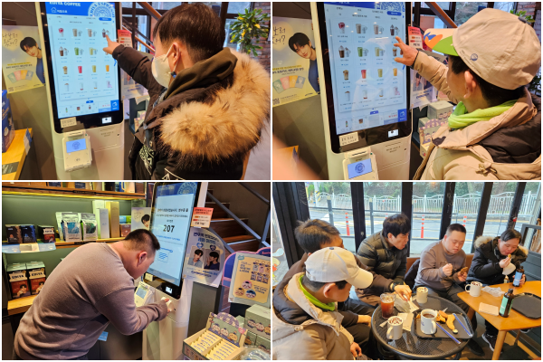 카페에서 키오스크를 이용하여 각자 먹고 싶은 메뉴를 선택하고 계산하여 먹었습니다.
