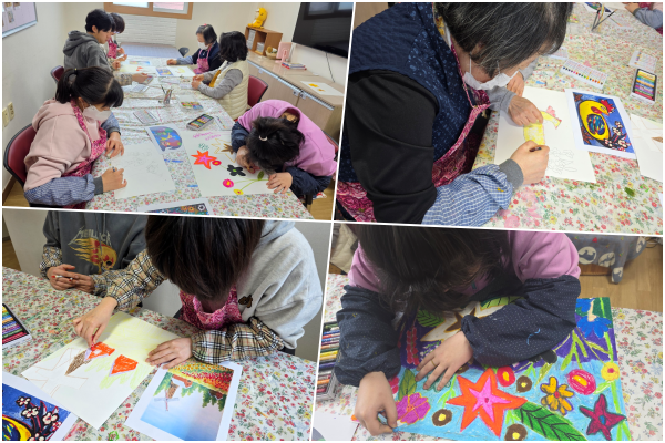 크레파스, 오일파스텔 등을 활용하여 각자 그리고 싶은 것을 그렸습니다.