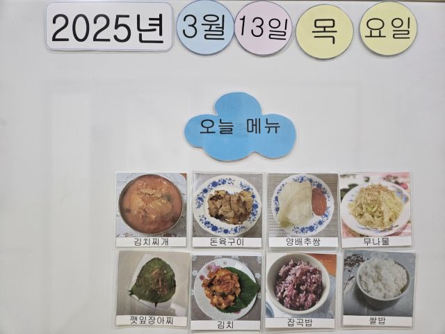 김치찌개, 돈육구이, 양배추쌈, 무나물, 깻잎장아찌, 김치