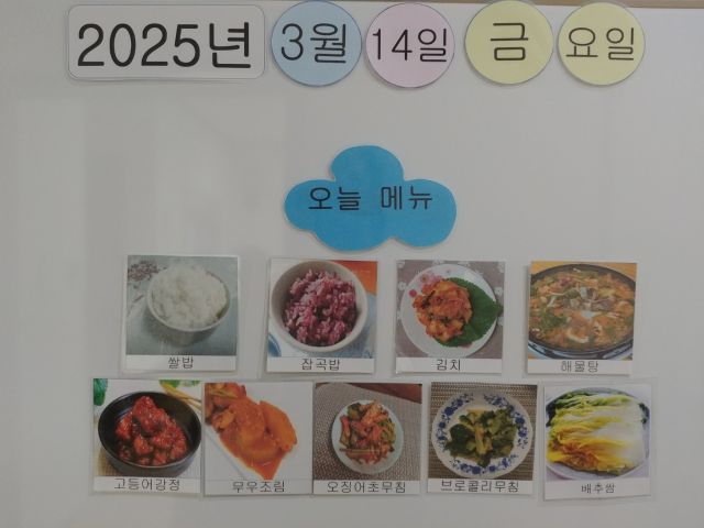 쌀밥, 잡곡밥, 해물탕, 고등어강정, 무조림, 오징어초무침, 브로컬리두부무침, 배추쌈, 김치