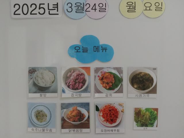 쌀밥, 잡곡밥, 시레기국, 닭볶음탕, 숙주나물무침, 오징어채무침, 김치, 상추쌈