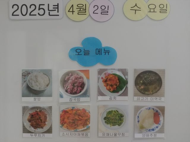 쌀밥, 잡곡밥, 쇠고기미역국, 두루치기, 소시지야채볶음, 유채나물무침, 김치, 양배추쌈