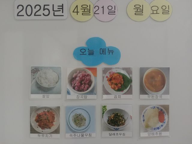 쌀밥, 잡곡밥, 무된장국, 두루치기, 숙주나물무침, 달래초무침, 김치, 양배추쌈