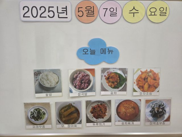 쌀밥, 잡곡밥, 김치찌개, 두루치기, 파래무침, 감자조림, 미역무침, 장아찌 ,김치