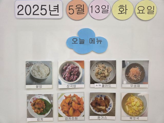 쌀밥, 잡곡밥, 북엇국, 돈까스, 감자조림, 야채샐러드, 무생채, 김치
