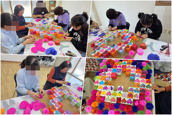 하트모양판에 한지와 색지 등을 이용하여 꽃 화환을 만들었습니다.