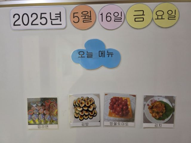 오늘의 점심메뉴: 컵라면, 김밥, 방울토마토, 김치