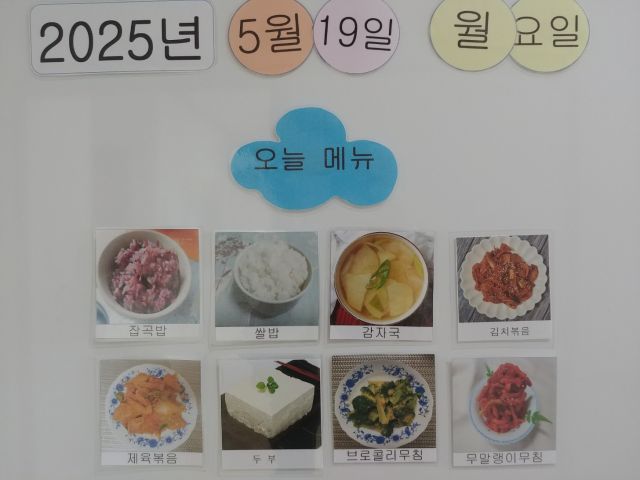 쌀밥, 잡곡밥, 감자국, 돈두루치기, 무말랭이무침, 브로콜리, 김치볶음, 두부