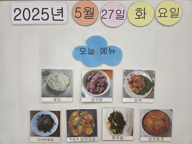 쌀밥, 잡곡밥, 김치찌개, 각재기 조림, 고사리볶음, 톳무침, 김치