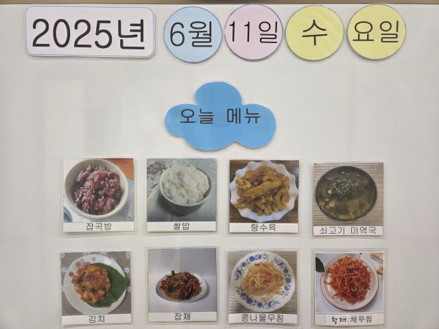 쌀밥, 잡곡밥, 탕수육, 잡채, 소고기미역국, 콩나물무침, 김치, 황태채무침