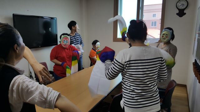 멋있게 채색한 탈과 한삼을 끼고 탈춤을 배워봤어요~