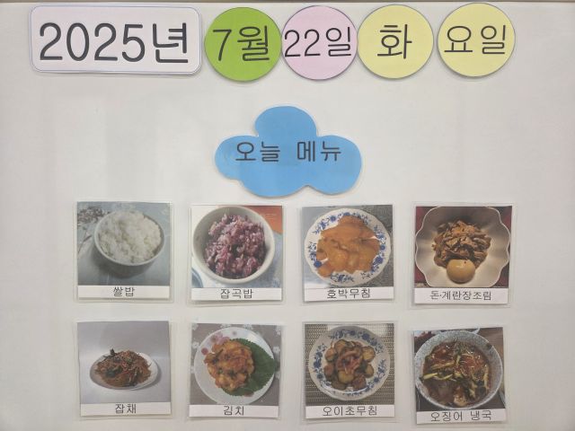 쌀밥, 잡곡밥, 오징어냉국, 돈 장조림, 잡채, 오이초무침, 호박나물, 김치