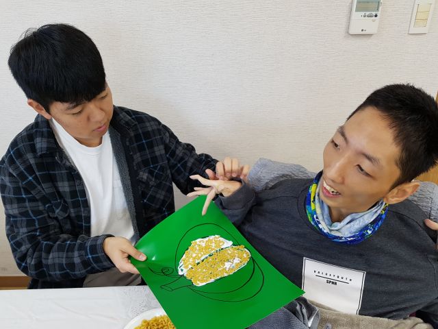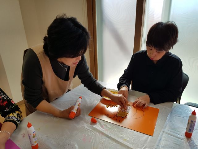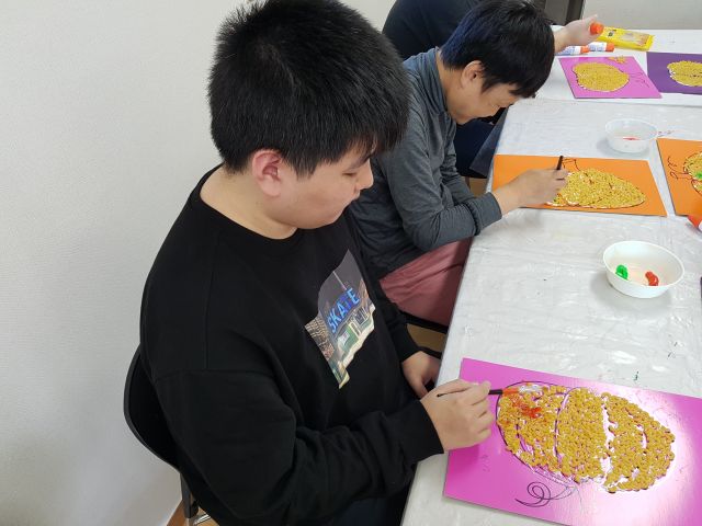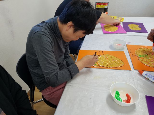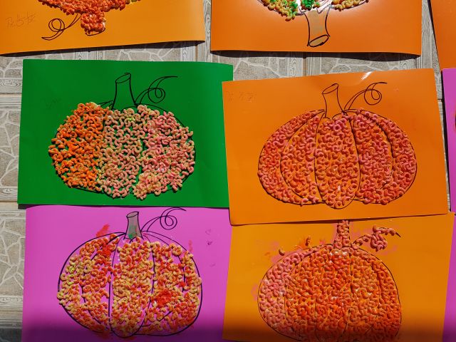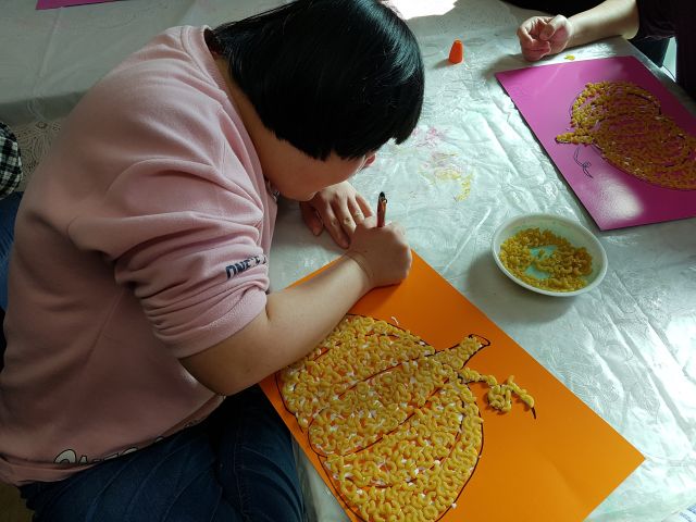 오늘 아트 프로그램 시간에는 마카로니를 이용하여 호박 꾸미기를 해보았어요.