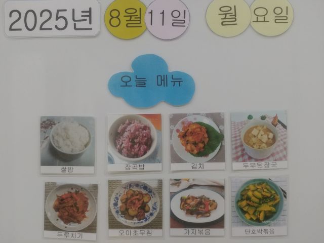 쌀밥, 잡곡밥, 두부된장국, 돈두루치기, 가지볶음, 오이초무침, 호박나물, 김치