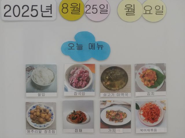 쌀밥, 잡곡밥, 쇠고기미역국, 가지나물, 잡채, 메추리알조림, 북어채볶음, 김치