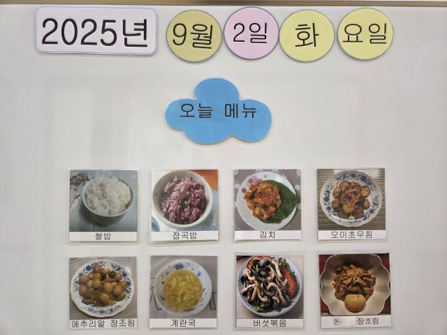 쌀밥, 잡곡밥, 계란국, 돈 장조림, 메추리알 조림, 버섯볶음, 오이초무침, 김치