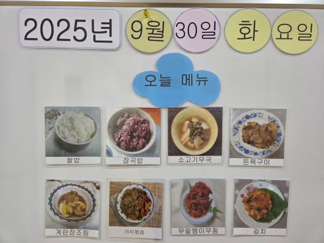 쌀밥, 잡곡밥, 소고기무국, 돈육구이, 계란장조림, 가지볶음, 무말랭이무침, 김치