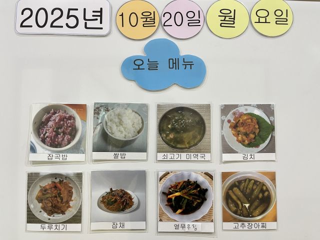 쌀밥, 잡곡밥, 쇠고기미역국, 돈두루치기, 열무무침, 잡채, 김치, 장아찌