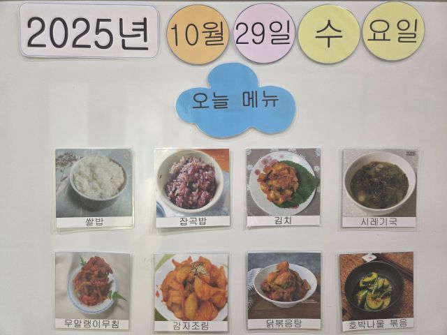쌀밥, 잡곡밥, 시래기국, 닭도리탕, 감자조림, 호박볶음, 무말랭이무침, 김치