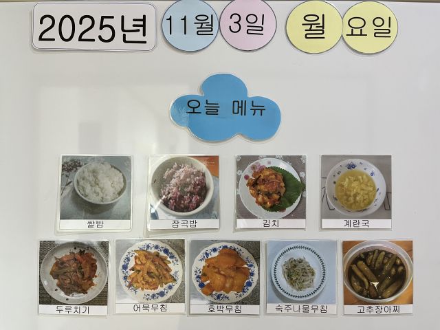 쌀밥, 잡곡밥, 계란국, 돈두루치기, 호박나물, 숙주나물, 어묵초무침, 김치, 장아찌