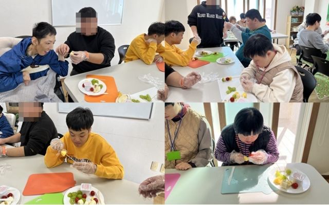 과일을 잘라 꼬챙이에 꿰어 과일꼬치를 만들었습니다.