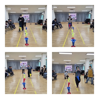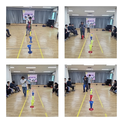 훌라후프를 이용한 꼬깔 옮기기 및 색판 뒤집기를 하였습니다.