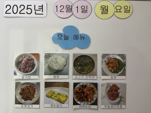 쌀밥, 잡곡밥, 쇠고기미역국, 돈두루치기, 무말랭이무침, 계란말이, 어묵조림, 김치