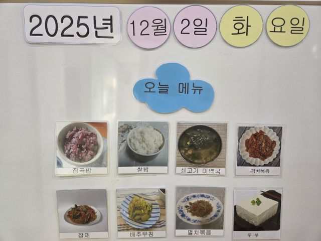 쌀밥, 잡곡밥, 볶음김치, 두부, 잡채, 소고기 미역국, 멸치볶음, 배추무침