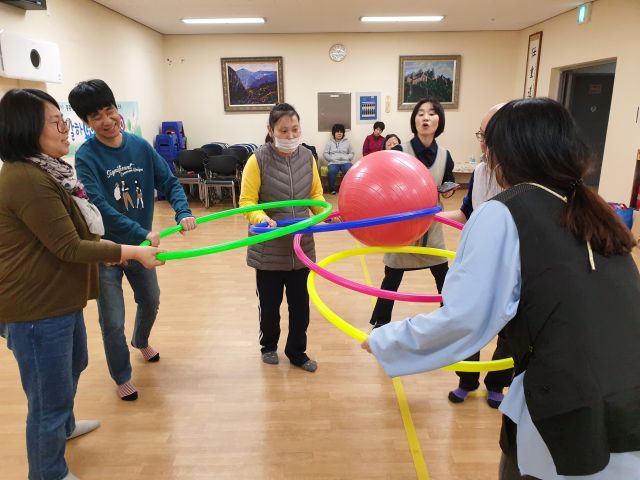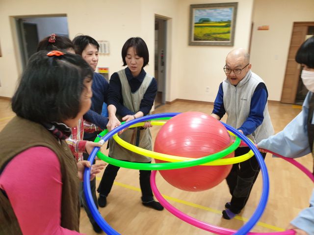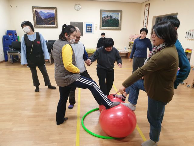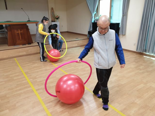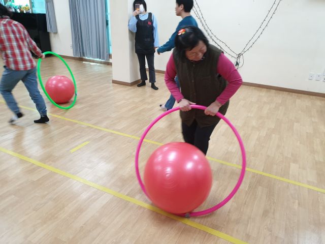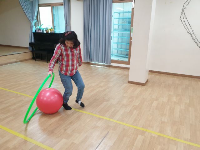 짐볼과 훌라후프를 이용하여 공을 굴리고 협동하는 활동을 하였습니다.