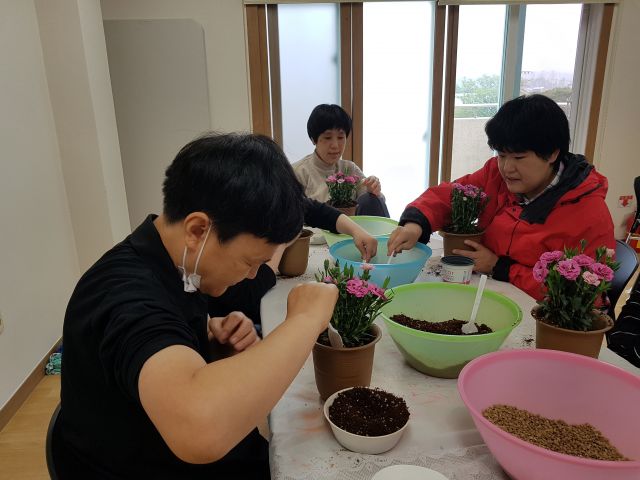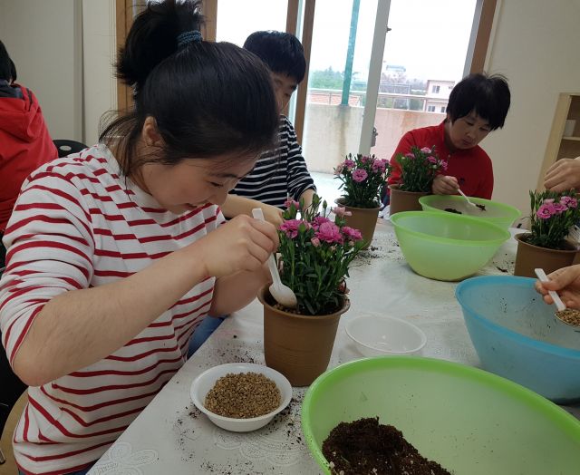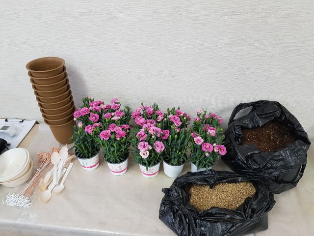 다과를 함께하며 원예 프로그램 영상을 시청하고 강사의 설명과 시범을 본 후 나만의 카네이션 분화심기에 도전해보았습니다.