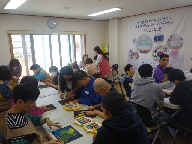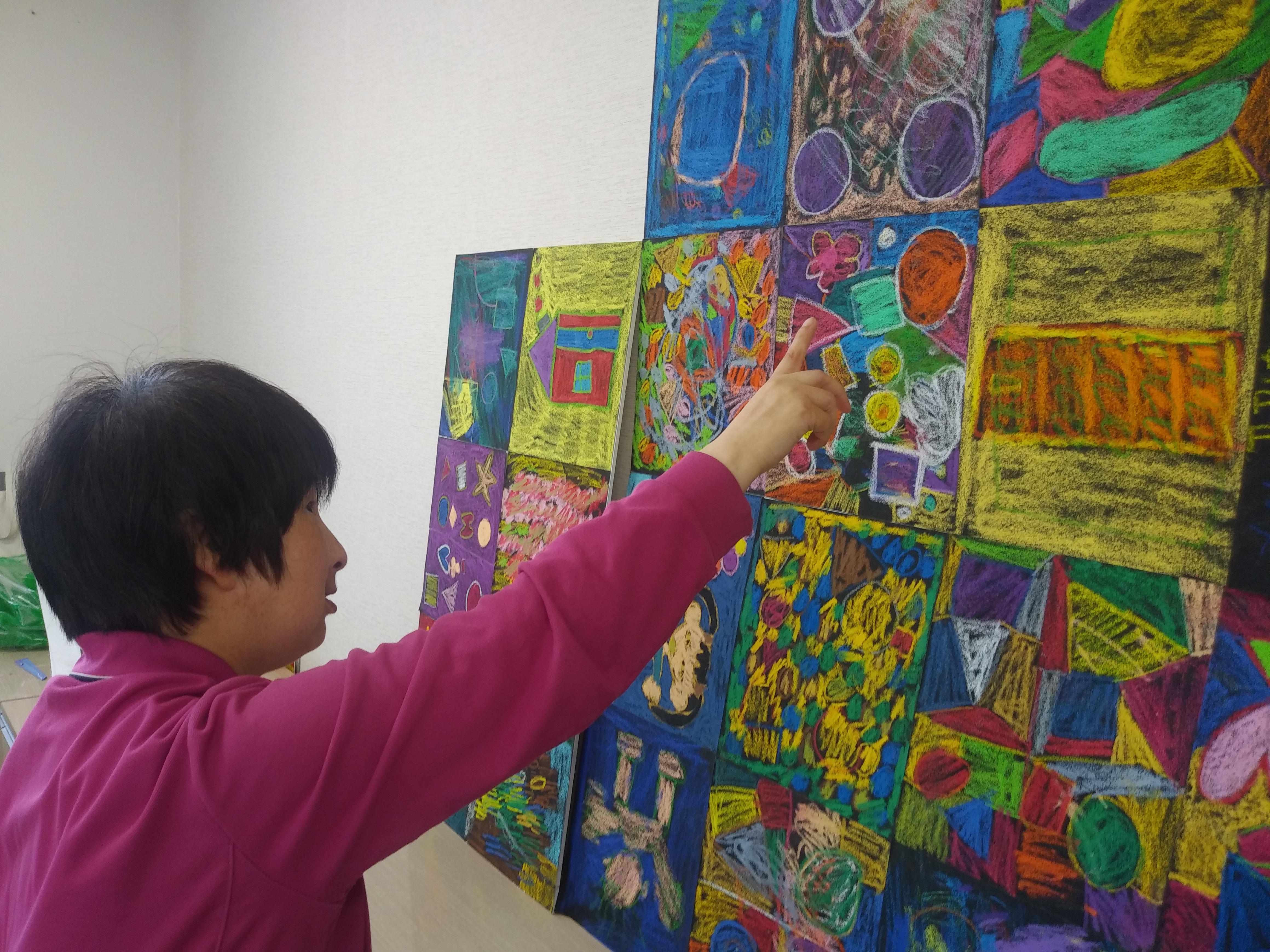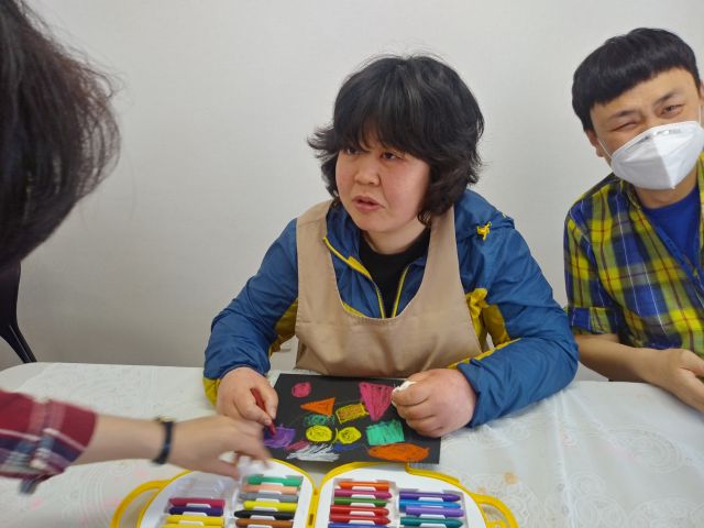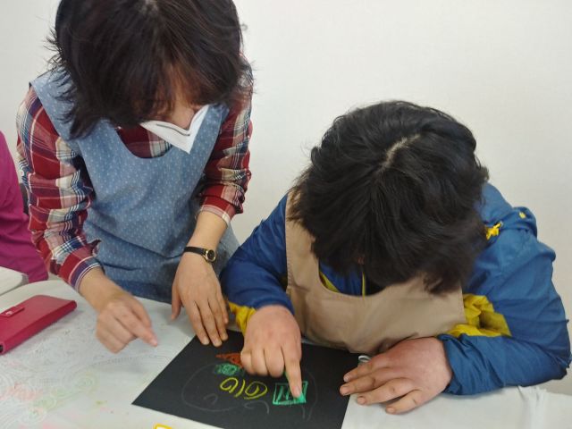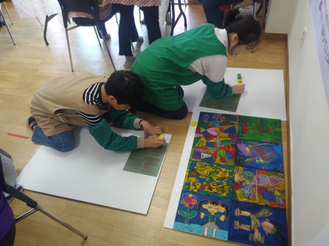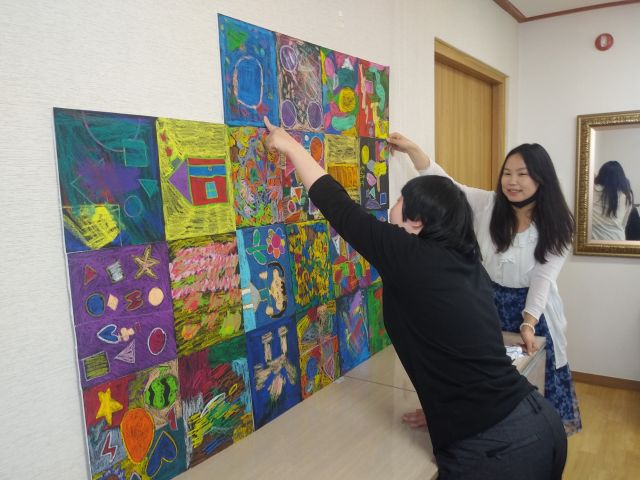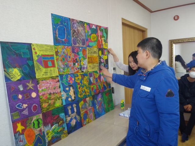 - 사포 위에 다양한 크레파스를 이용하여 각자가 그리고 싶은 그림을 표현하여 폼보드 위에 퍼즐처럼 조립하는 활동으로 이용이들과의 협력과 집중력을 향상시킬 수 있는 좋은 기회기 되었음.