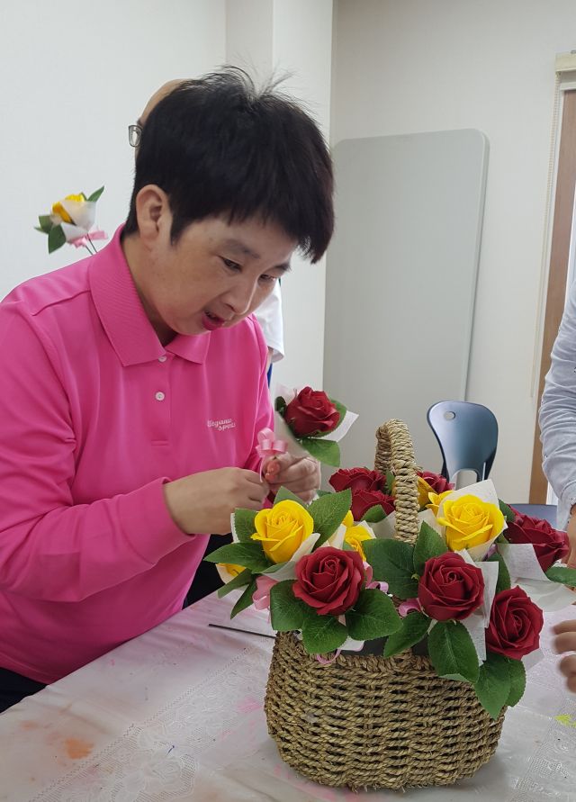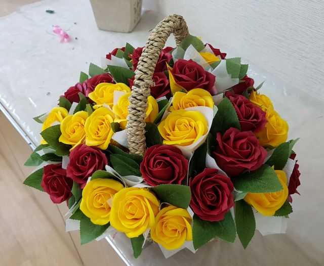 자신이 만든 꽃을 바구니에 꽂아 꽃바구니를 완성하였습니다.