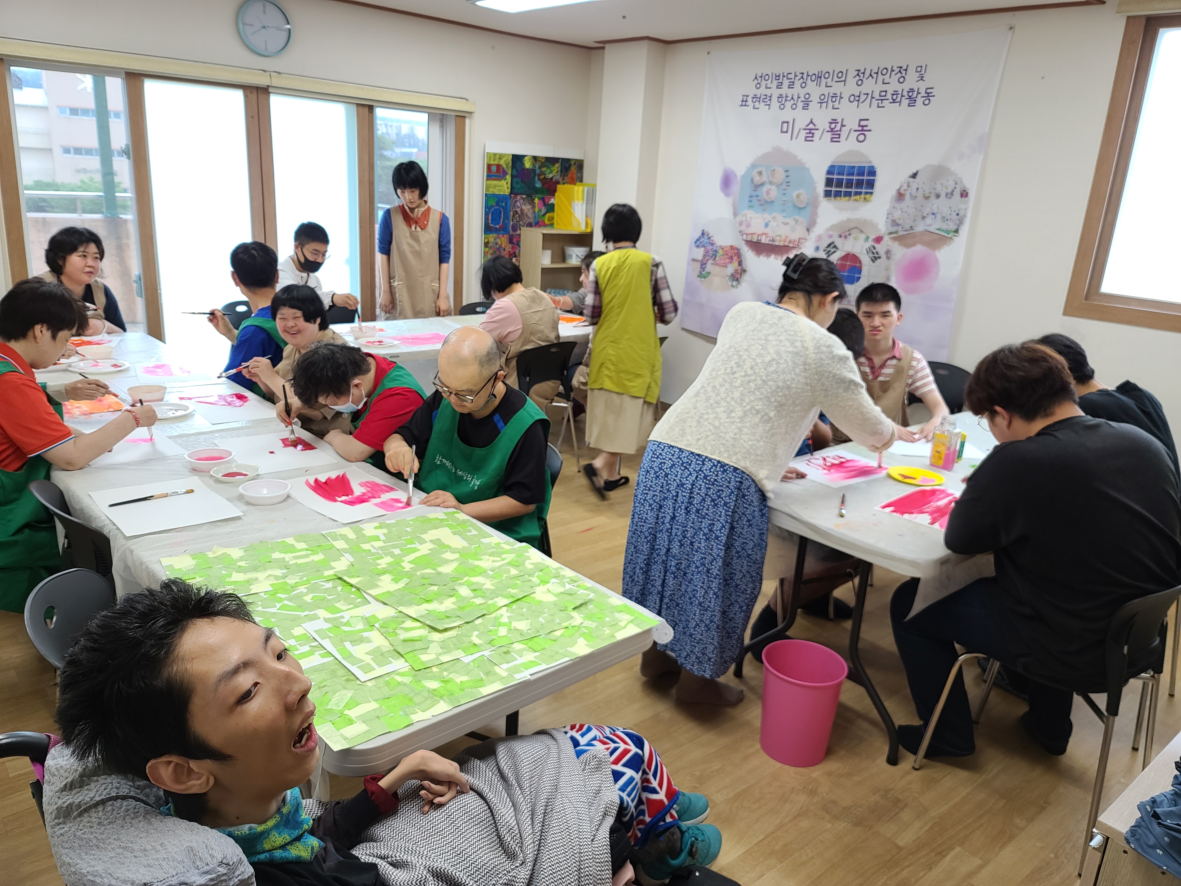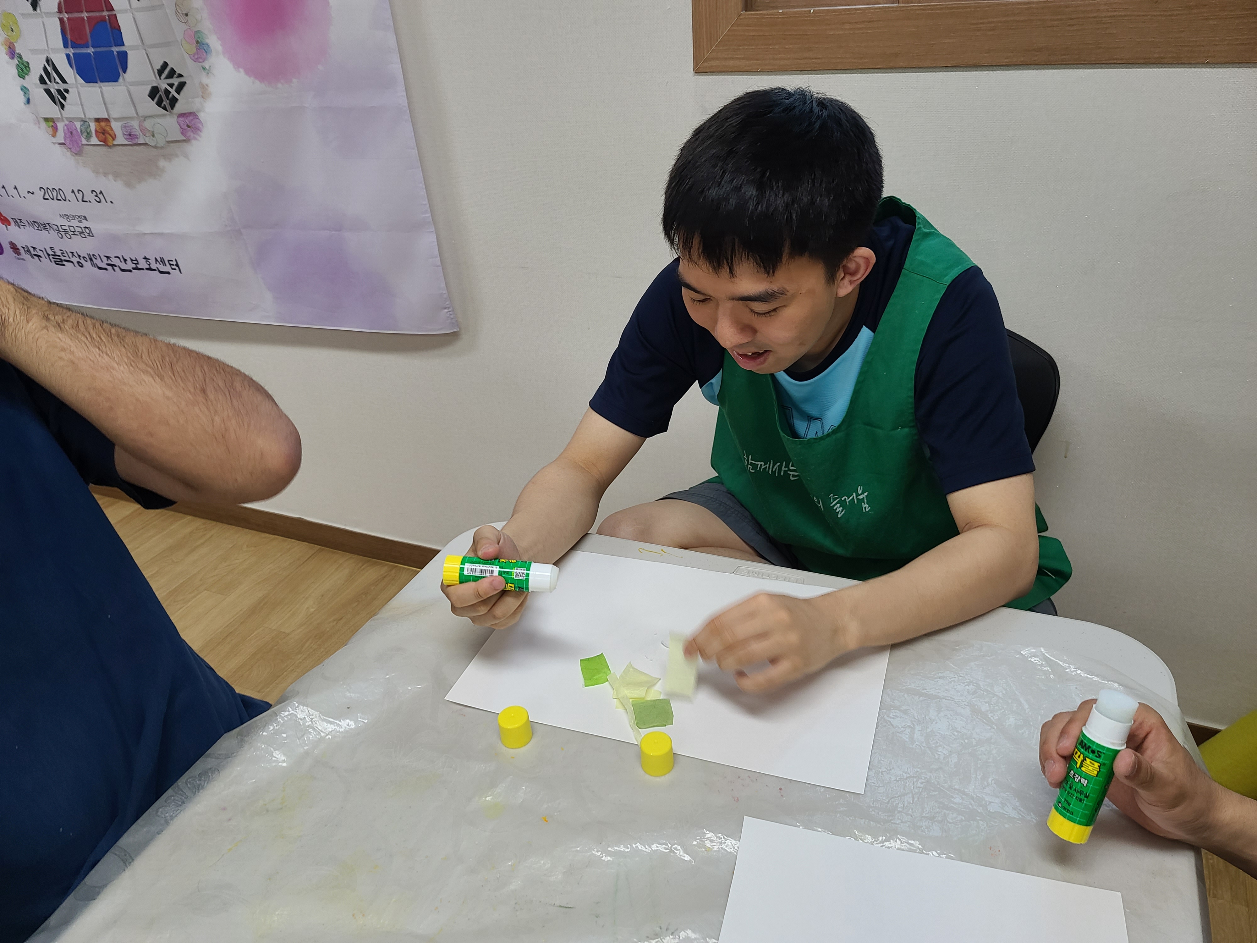 - 오늘은 한지를 잘게 찢어 도화지에 풀칠하기, 빨강, 노랑, 분홍색 수채화 물감을 이용하여 각자가 원하는 색을 선택하여 도화지에 채색 활동을 하였습니다.