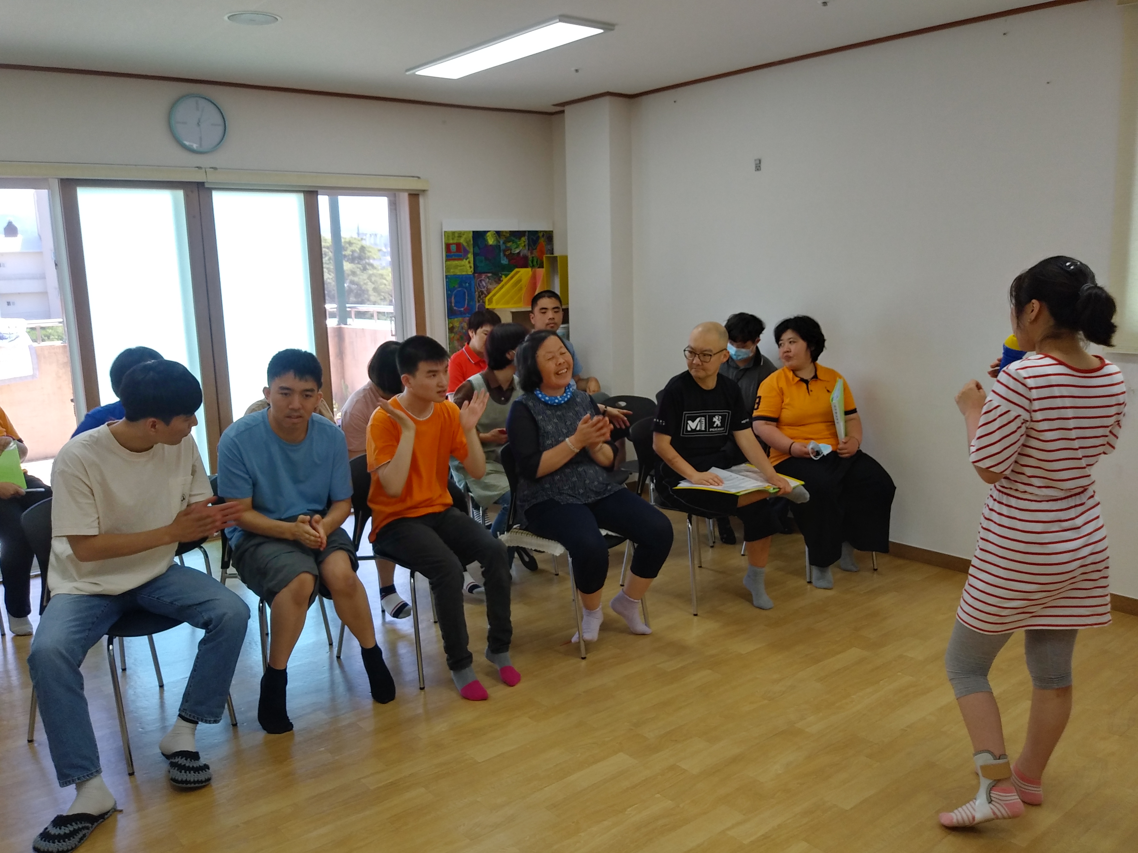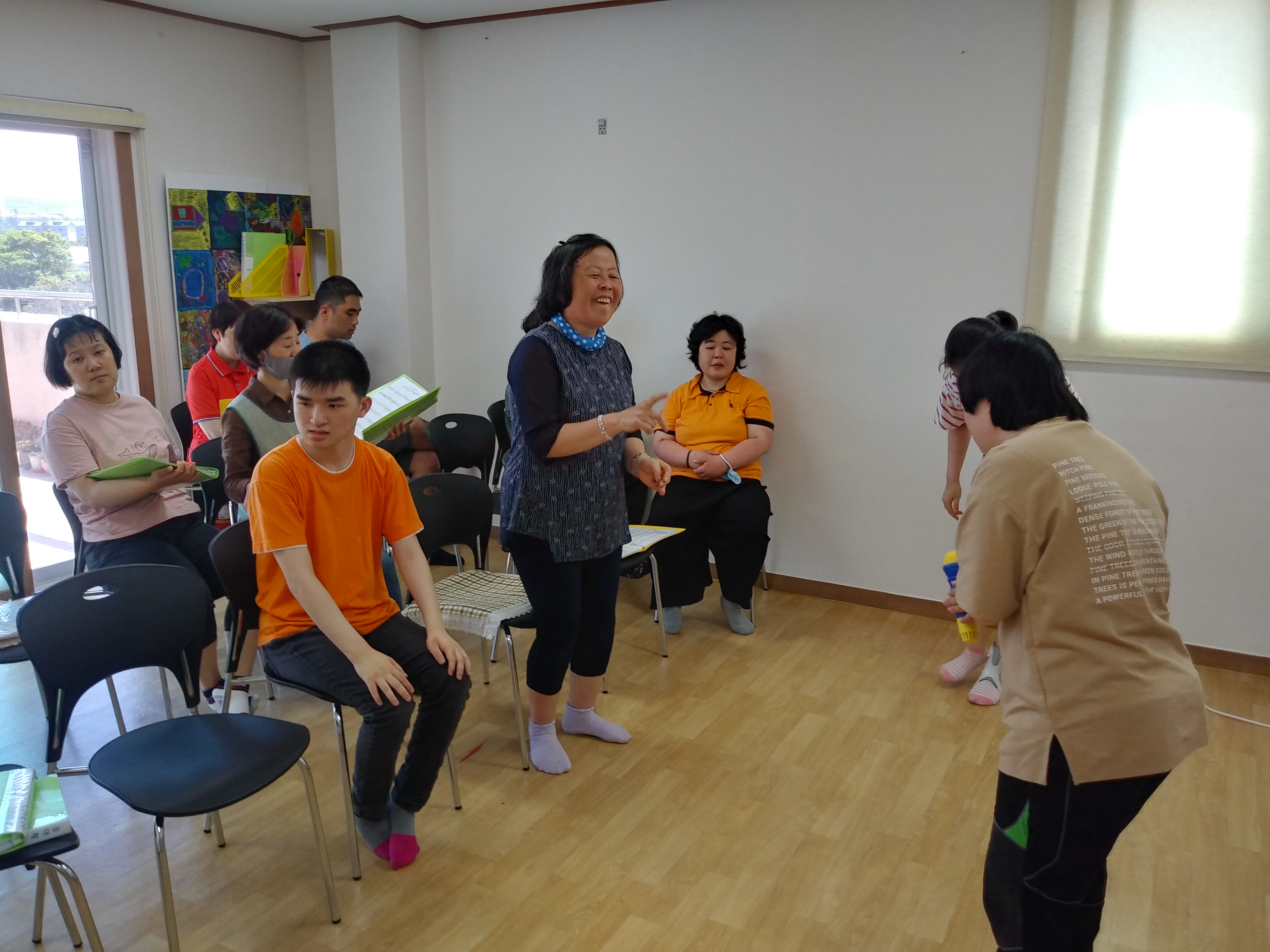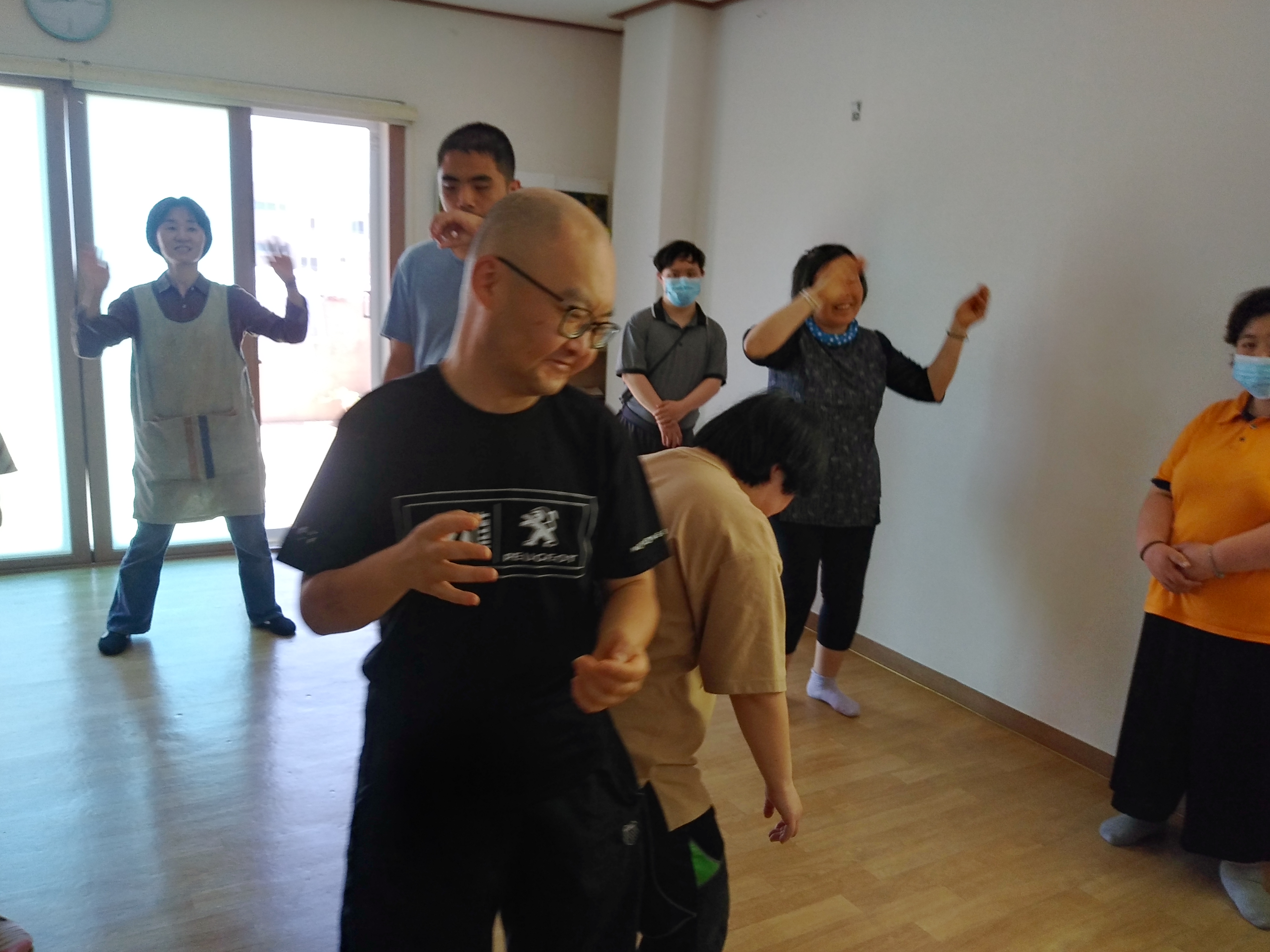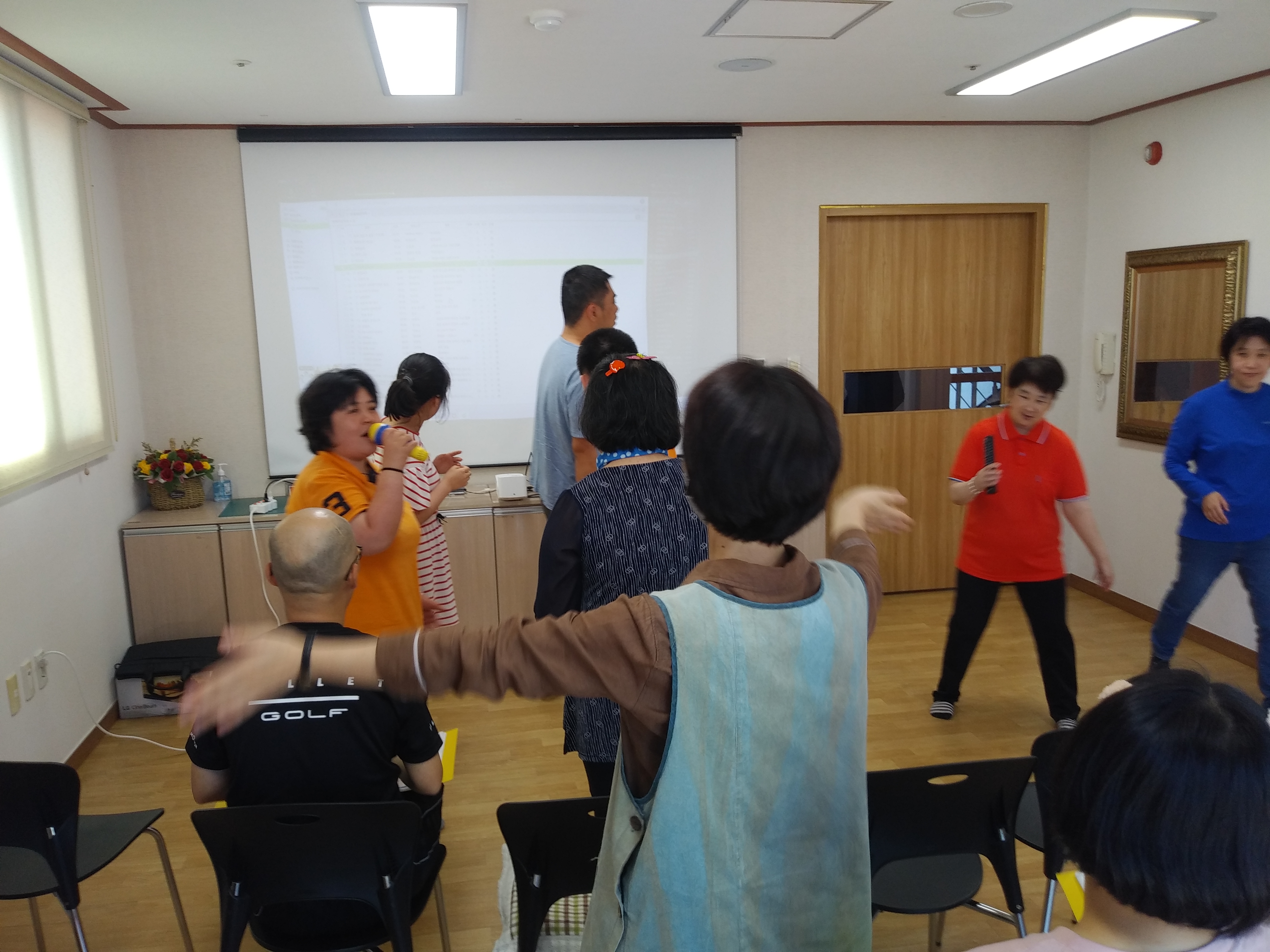 6월 22일 오전, 음악활동으로 이용인들의 각자 부르고 싶은 곡을 선택하여 노래 부르며 춤을 추며 즐거운 시간을 보냈습니다.