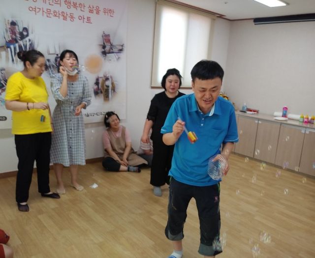 바닥에 떨어진 비누방울을 손으로 터트리며 즐거운 시간 보냈습니다